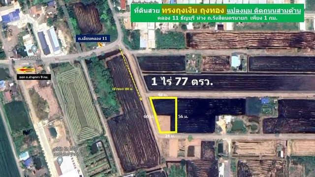 ที่ดินสวย ทรงถุงเงินถุงทอง แปลงมุม คลอง 11 ธัญญะ ขนาด 1 ไร่ 77 ตรว.
