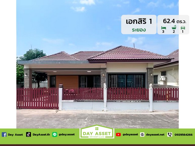 ขายบ้านเดี่ยวชั้นเดียว หมู่บ้าน เอกสิริ 1 ระยอง ทำเลดี อยู่ในย่านชุมชน เดินทางสะดวก เนื้อที่ 62.4 ตร.ว. ขายเพียง 2,050,000 ล้านบาท