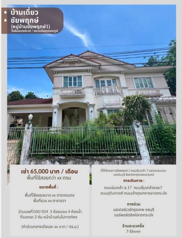ขาย/เช่าบ้านเดี่ยว 2 ชั้น หมู่บ้านชัยพฤกษ์ 1 ซอยคุ้มเกล้า 7 ถนนสุวินทวงศ์