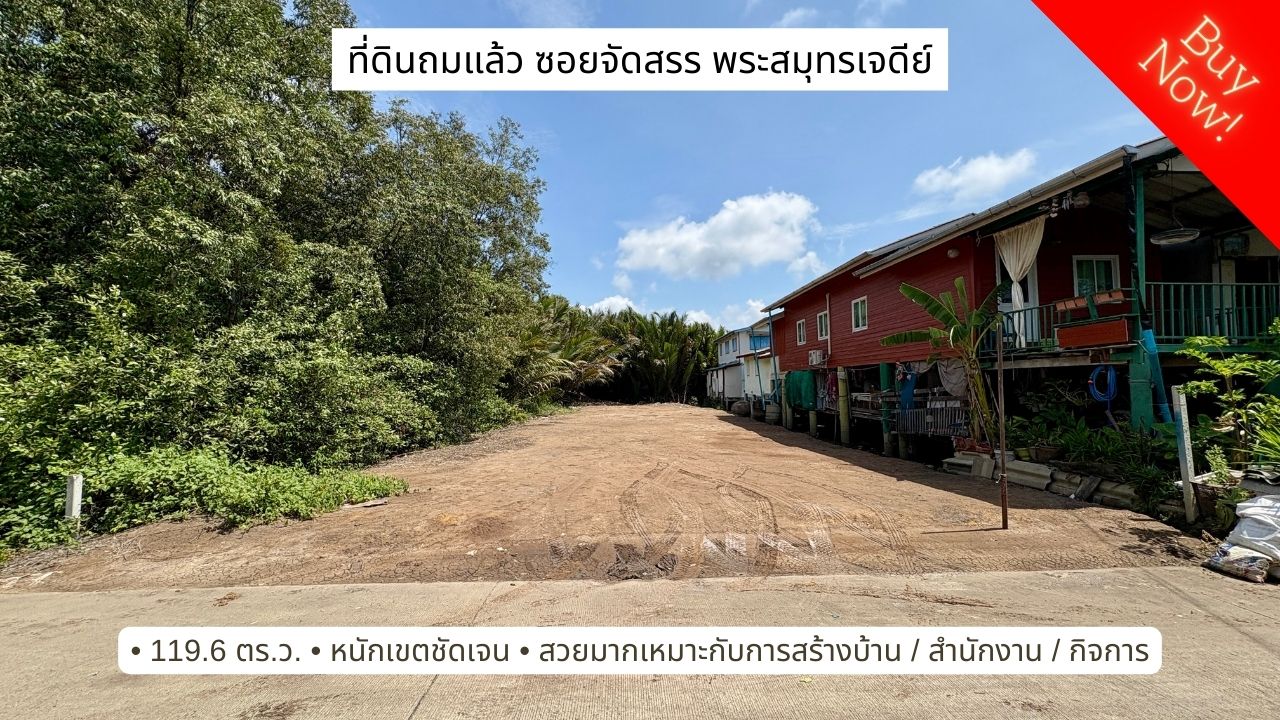 ขายที่ดิน ถมแล้วสวยมาก ซอยจัดสรรค์ ถ.คลองสรรพสามิต ต.ในคลองบางปลากด อ.พระสมุทรเจดีย์ ทรงสี่เหลี่ยม 119.6 ตารางวา ผังสีส้ม