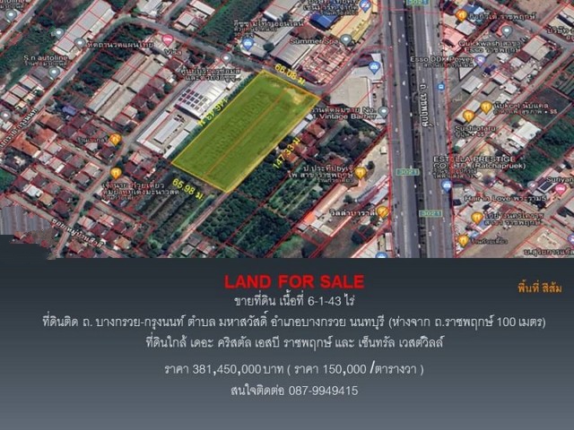 ขายที่ดินราชพฤกษ เนื้อที่ 6-1-43 ไร่ ถ. บางกรวย-กรงนนท ตำบล มหาสวัสดิ์ อำเภอบางกรวย จังหวัดนนท์บุรี (หางจาก ถ.ราชพฤกษ 100 เมตร)