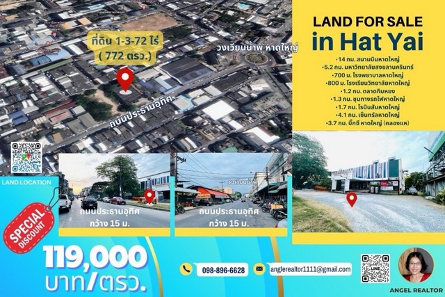 ขายที่ดิน หาดใหญ่ ติดถนนประธานอุทิศ ใกล้วงเวียนน้ำพุ 1-3-72 ไร่ (772 ตรว.)